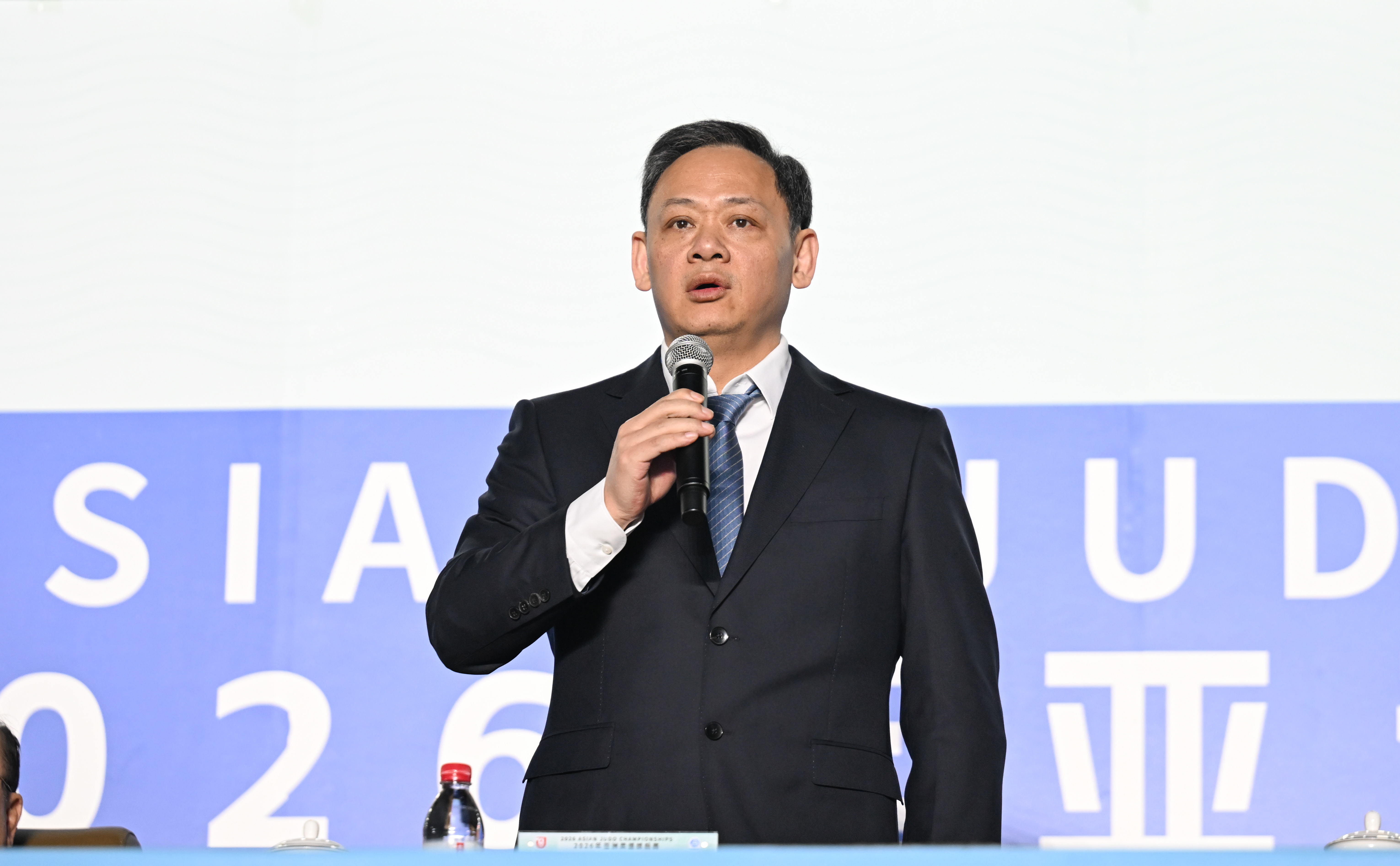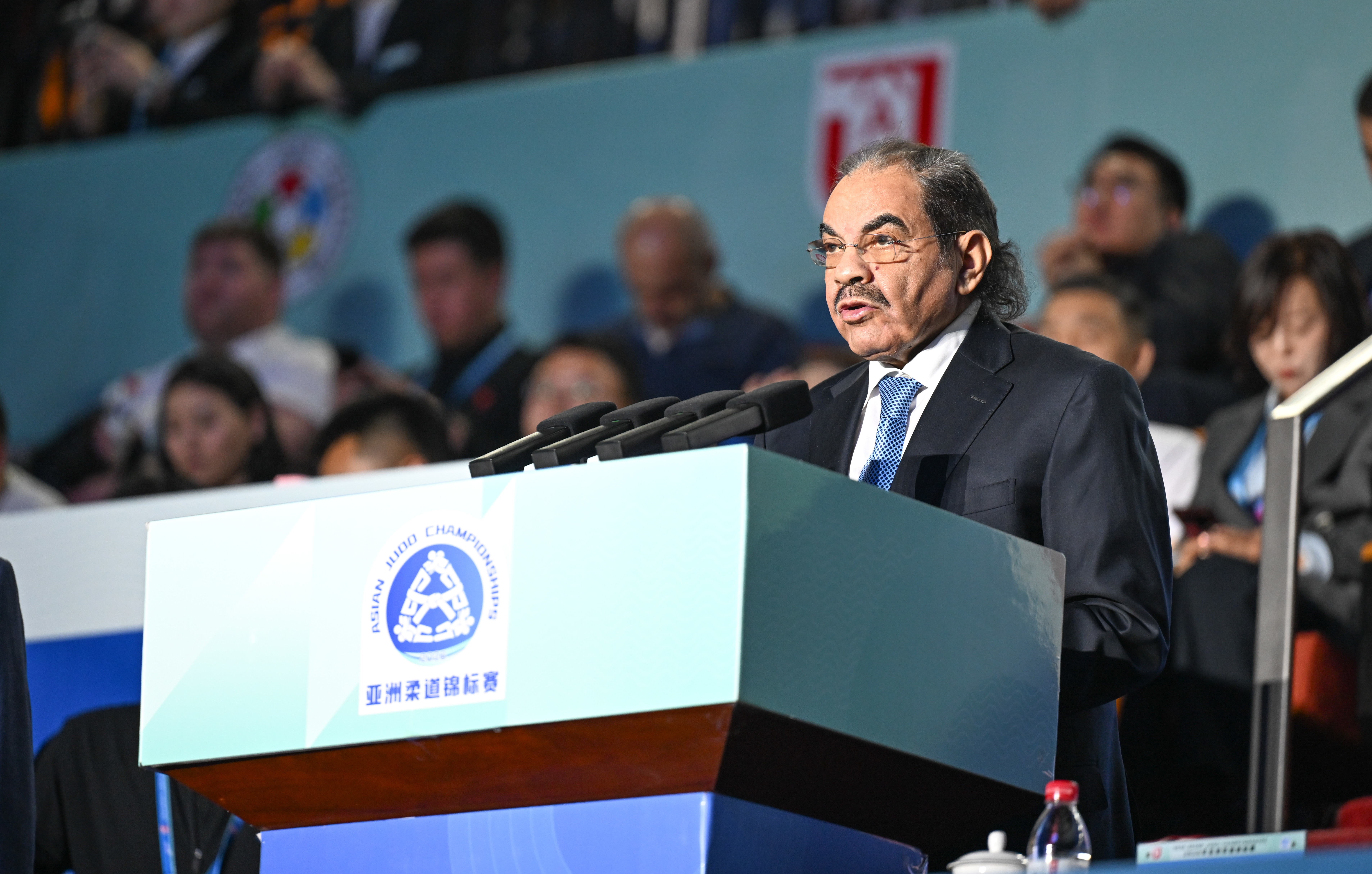 4月16日,亚洲柔道联合会主席欧拜德·安齐在开幕式上讲话。新华社记者 贝赫 摄